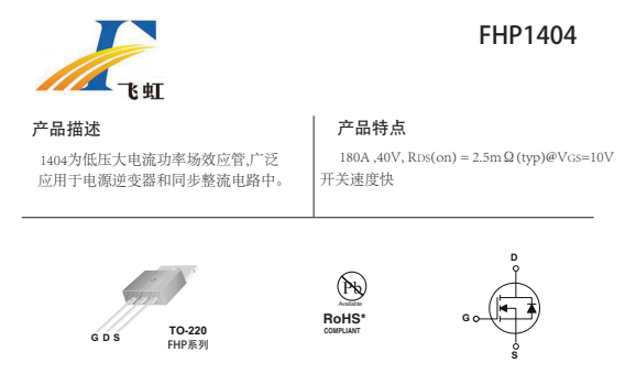 FHP1404的主要封裝形式是TO-220,腳位排列位GDS。這款1404場效應(yīng)管產(chǎn)品具體參數(shù):Vgs(±V):25;VTH(V):2.5-4;ID(A):180;BVdss(V):40。RDS (on) = 2.5mΩ(typ)@V GS =10V,180A大電流40V電源MOS管開關(guān)速度快。