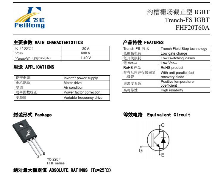 為何?這是由于FHF20T60A的IGBT單管除了高可靠性和反向并行的快恢復二極管特性外,還擁有拖尾電流非常短、關斷損耗低、出色的Vcesat飽和壓降以及正溫度系數等特點。