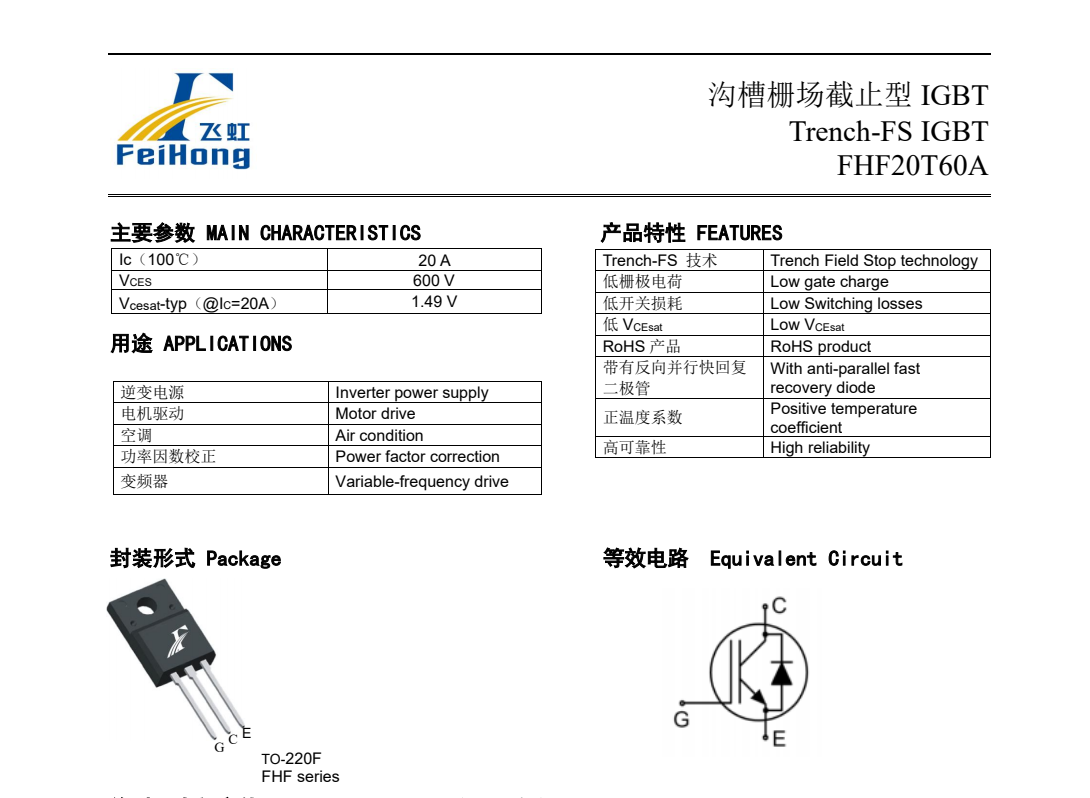 FHF20T60A是一款場(chǎng)N溝道溝槽柵截止型IGBT,使用Trench Field stop Ⅱ technology 和通過優(yōu)化工藝,來獲得極低的 VCEsat 飽和壓降。